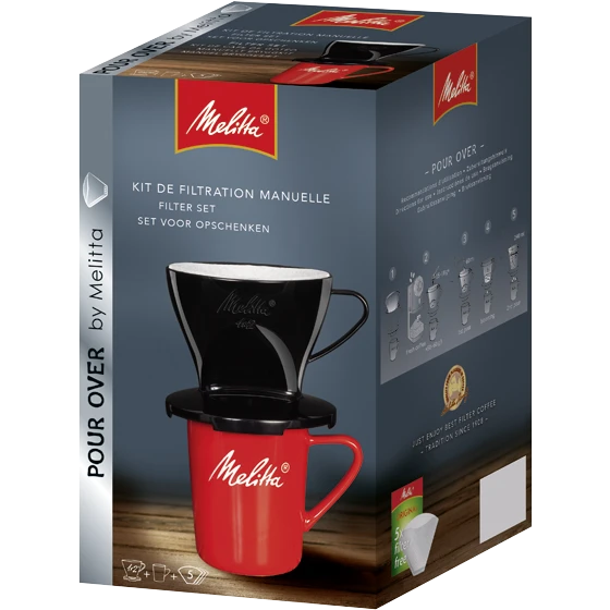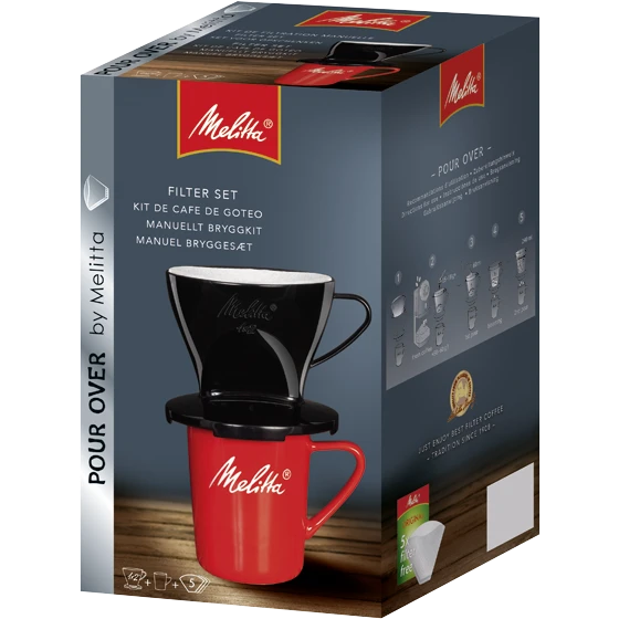 Steig ein in den heißesten aktuellen Kaffee-Trend: „Pour Over“. Dieses Set umfasst einen für die Handfiltration optimierten Kaffeefilter 1×2®, eine Porzellantasse sowie passende Filtertüten® von Melitta®.