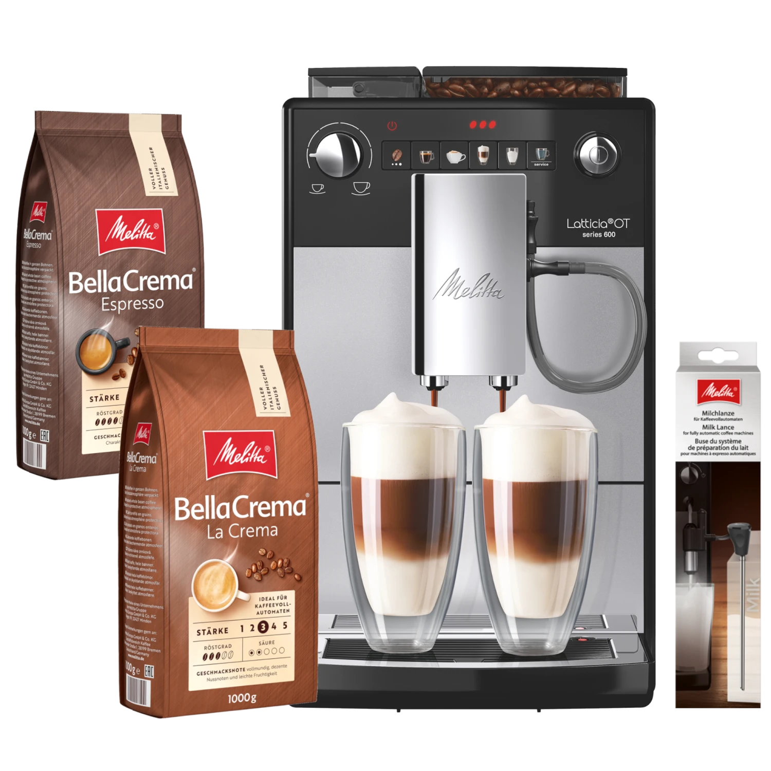 Erlebe mit dem Melitta® Latticia® OT Genuss-Set Kaffee-Spezialitäten wie in Deinem Lieblingscafé, ganz bequem auf Knopfdruck. Dieses exklusive Set enthält neben dem kompakten Kaffeevollautomaten eine zusätzliche Milchlanze und 2 kg unserer feinsten Kaffees – BellaCrema® LaCrema und BellaCrema® Espresso.