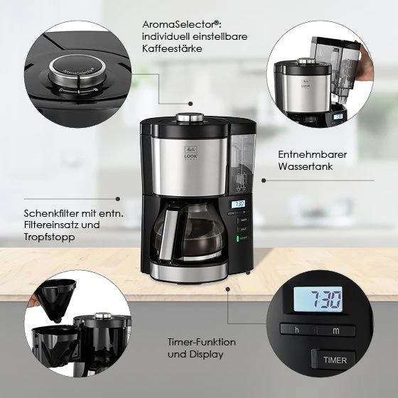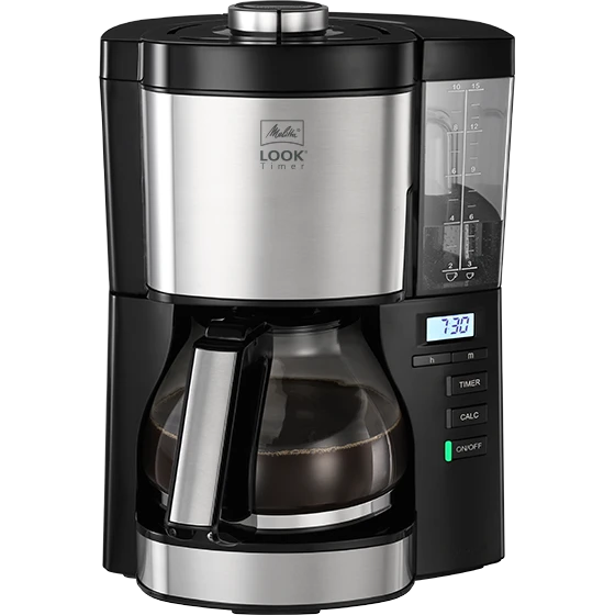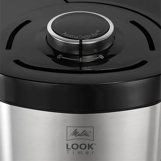 Die Melitta® LOOK® Timer ist ihrer Zeit voraus. Auf den ersten Blick fällt das moderne Design mit vielen hochwertigen Edelstahl-Elementen ins Auge. Auf den zweiten Blick wird sie dich mit zahlreichen Funktionen, wie dem abnehmbaren Wassertank, unserem patentierten AromaSelector® und der praktischen Timer-Funktion, begeistern. Und spätestens auf den dritten Blick wirst du sie dank des hervorragenden Kaffee-Ergebnisses lieben.